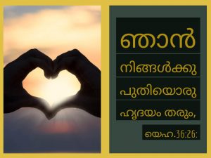 ഞാൻ നിങ്ങൾക്കു പുതിയൊരു ഹൃദയം തരും; പുതിയൊരു ആത്മാവിനെ ഞാൻ നിങ്ങളുടെ ഉള്ളിൽ ആക്കും; കല്ലായുള്ള ഹൃദയം ഞാൻ നിങ്ങളുടെ ജഡത്തിൽനിന്നു നീക്കി മാംസമായുള്ള ഹൃദയം നിങ്ങൾക്കു തരും.