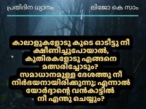 കാലാളുകളോടു കൂടെ ഓടീട്ടു നീ ക്ഷീണിച്ചുപോയാൽ, കുതിരകളോടു എങ്ങനെ മത്സരിച്ചോടും? സമാധാനമുള്ള ദേശത്തു നീ നിർഭയനായിരിക്കുന്നു; എന്നാൽ യോർദ്ദാന്റെ വൻകാട്ടിൽ നീ എന്തു ചെയ്യും? -യിരമ്യാവു 12:5വീട്ടുജോലിക്കു ആളെ ആവശ്യമുണ്ട്