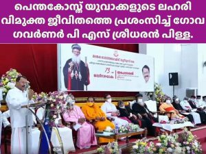 പെന്തെകോസ്ത് യുവാക്കളുടെ മദ്യവർജ്ജന നിലപാട് മാതൃകാപരമാണന്നും സഭയുടെ പ്രബോധനവും പാസ്റ്റർന്മാരുടെ ശ്രദ്ധയുമാണ് അതിനു കാരണമെന്നും ഗോവ ഗവർണർ പി എസ് ശ്രീധരൻ പിള്ള.പരസ്യയോഗ ടീമിന് വാഹനം ആവശ്യമുണ്ട്