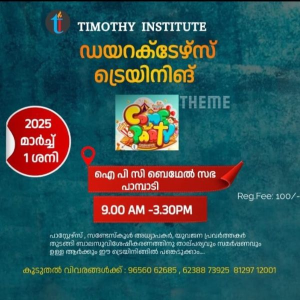 പാമ്പാടി : തിമഥി ഇൻസിസ്റ്റുഡ് ചിൽഡ്രൻസ് ഫെസ്റ്റ് ഡയറക്ടെഴ്സ് ട്രെയിനിങ് ക്യാമ്പ് മാർച്ച് ഒന്നാം തീയതി ശനിയാഴ്ച രാവിലെ 9 : 30 മുതൽ 4 പിഎം വരെ പാമ്പാടി ബദേൽ സഭയിൽ വെച്ച് നടക്കുന്നതാണ്.