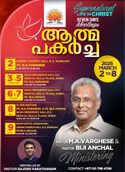 ഫയർ ഓഫ് റിവൈവൽ സഭയുടെ എൽഡേഴ്സ് ചെറിയാൻ എം. ചെറിയാൻ, സുരേഷ് കുമാർ, ജോഷുവ അലക്സാണ്ടർ, സുജാതൻ നായർ മീറ്റിങ്ങുകളുടെ ഒരുക്കങ്ങൾക്ക് നേതൃത്വം നൽകുന്നു. മീറ്റിങ്ങുകളിൽ സംബന്ധിക്കുവാൻ താത്പര്യം ഉള്ളവർക്ക് യാത്രാ സൗകര്യം ആവശ്യമെങ്കിൽ വിളിക്കേണ്ട നമ്പർ – +971 58 644 9108.