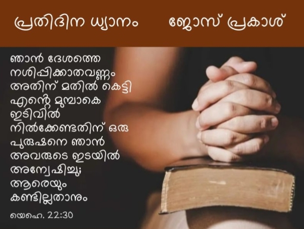 പ്രാർത്ഥന ദൈവമക്കളുടെ പ്രാണവായുവാണ്. പ്രാർത്ഥനയ്ക്ക് പ്രായമോ, പദവിയോ, സഭയോ തടസ്സമല്ല. ആർക്കും എവിടെയും എപ്പോഴും ദൈവത്തോട് സംസാരിക്കാം. സംഹാരകൻ ദേശത്തെ നശിപ്പിക്കാതിരിക്കേണ്ടതിന് നമുക്ക് പ്രാർത്ഥനാ മതിൽ പണിയാം.