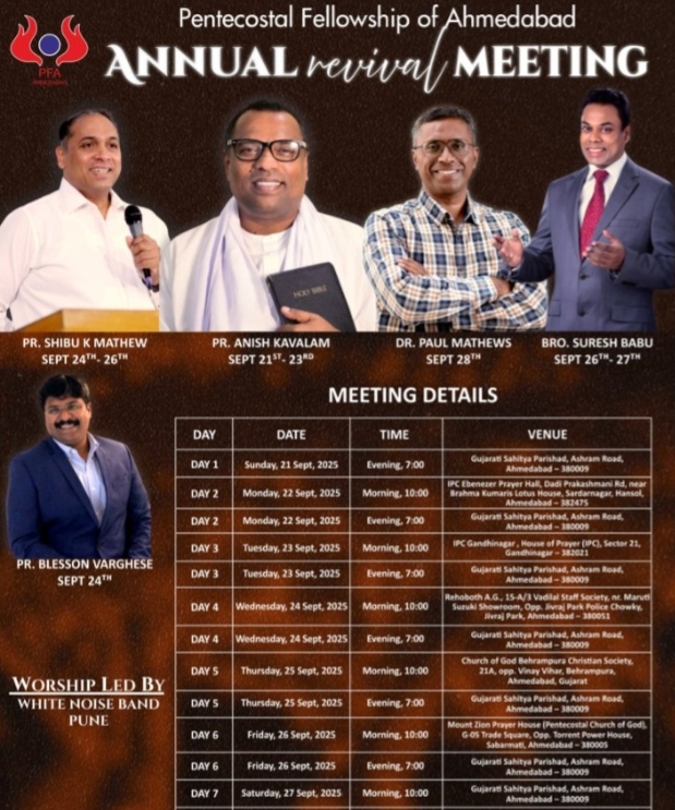 അഹമ്മദാബാദ്: പെന്തെക്കോസ്തൽ ഫെലോഷിപ്പ് അഹമ്മദാബാദിന്റെ (PFA) നേതൃത്വത്തിൽ സെപ്റ്റംബർ 21 ഞായറാഴ്ച മുതൽ 28 ഞായർ വരെ ഉണർവ് യോഗവും, ഞായറാഴ്ച്ച സംയുക്ത ആരാധനയും നടക്കും.