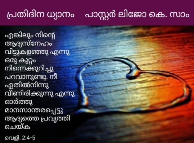 “എങ്കിലും നിന്റെ ആദ്യസ്നേഹം വിട്ടുകളഞ്ഞു എന്നു ഒരു കുറ്റം നിന്നെക്കുറിച്ചു പറവാനുണ്ടു. നീ ഏതിൽനിന്നു വീണിരിക്കുന്നു എന്നു ഓർത്തു മാനസാന്തരപ്പെട്ടു ആദ്യത്തെ പ്രവൃത്തി ചെയ്ക ” (വെളിപ്പാട് 2:4-5).