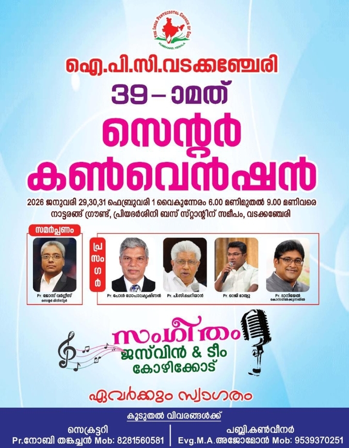 വടക്കഞ്ചേരി: ഇന്ത്യ പെന്തെക്കോസ്തു ദൈവസഭ വടക്കഞ്ചേരി സെന്ററിന്റെ നേതൃത്വത്തിൽ സംഘടിപ്പിക്കുന്ന വാർഷിക സെന്റർ കൺവൻഷൻ ജനുവരി 29, 30, 31, ഫെബ്രുവരി 1 തീയതികളിൽ വടക്കഞ്ചേരി പ്രിയദർശനി ബസ്റ്റാൻഡിന് സമീപമുള്ള നാട്ടരങ്ങ് ഗ്രൗണ്ടിൽ നടക്കും.