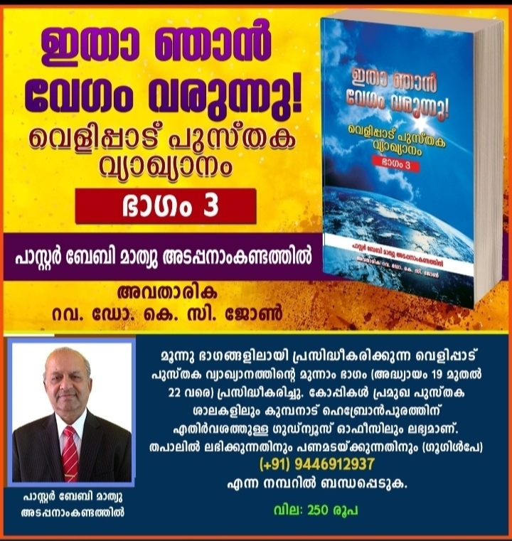 കോട്ടയം: പാസ്റ്റർ ബേബി അടപ്പനാംകണ്ടത്തിൽ എഴുതിയ “ഇതാ ഞാൻ വേഗം വരുന്നു ” – വെളിപ്പാട് പുസ്തകവ്യാഖ്യാനം മൂന്നാം ഭാഗം പ്രസിദ്ധീകരിച്ചു. ഗുഡ്ന്യൂസ് ബുക്സ് ആണ് പ്രസാധകർ. മൂന്നു ഭാഗങ്ങളായി പുറത്തിറക്കിയ വെളിപ്പാട് പുസ്തക വ്യാഖ്യാനം കുമ്പനാട് ഹെബ്രോൻപുരത്തിന് എതിർവശത്തുള്ള
