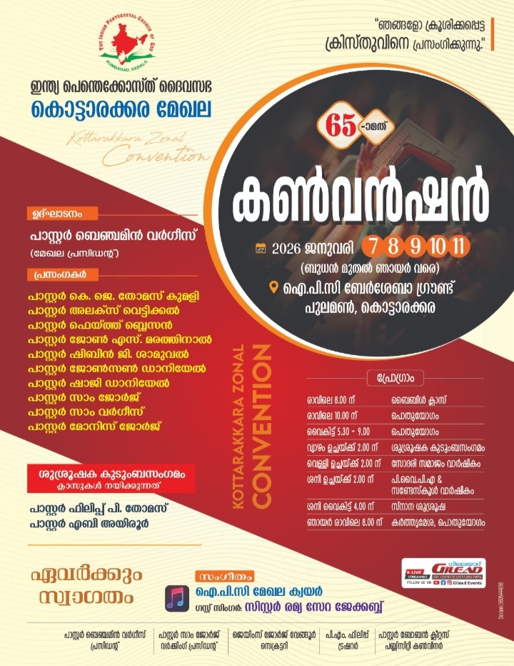 പാസ്റ്റർ ബിനു വാഴമുട്ടം ശുശ്രൂക്ഷിക്കുന്നതാണ്. കടന്നുവരുന്ന എല്ലാവർക്കും തിരികെ പോകാൻ വാഹന സൗകര്യം ഉണ്ടായിരിക്കുന്നതാണ്.