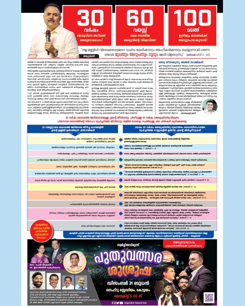 സ്വർഗീയ വിരുന്ന് പുതുവൽസര ശുശ്രൂഷ ഇന്ന് വൈകിട്ട് അഞ്ചു മുതൽ കോട്ടയം നെഹ്റു സ്റ്റേഡിയത്തിൽ നടക്കുന്നു. പതിനായിരങ്ങൾ ഒന്നിച്ച് പങ്കെടുക്കുന്ന ഈ പുതുവർഷ ശുശ്രൂഷ ഏഷ്യയിലെ തന്നെ ഏറ്റവും വലിയ പുതുവർഷ ശുശ്രൂഷയാണ്. ഈ വർഷം സിസ്റ്റർ സ്റ്റെല്ലാ ദിനകരൻ, പോൾ ദിനകരൻ, സിസ്റ്റർ ഇവാൻജെലിന് എന്നിവർ ശുശ്രൂഷിക്കും.