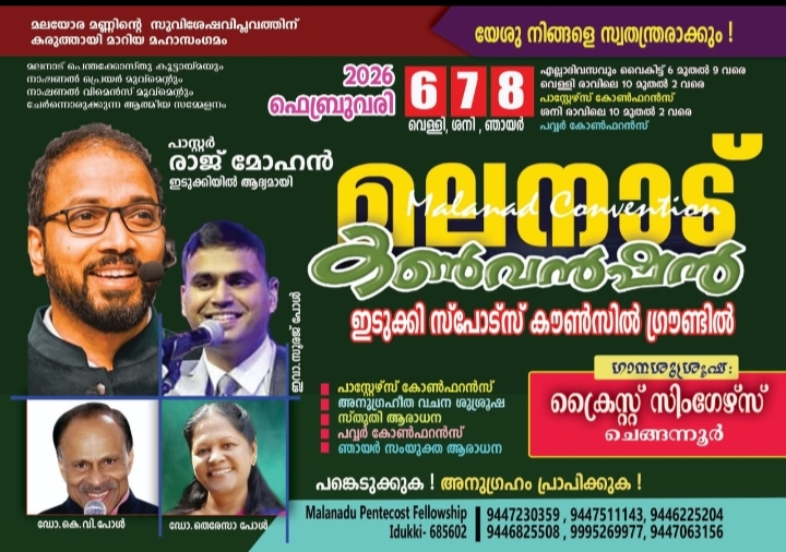 ഫെബ്രുവരി 6 വൈകുന്നേരം 6 മണിക്ക് മലനാട് പെന്തക്കോസ്ത് കൂട്ടായ്മ ചെയർമാൻ പാസ്റ്റർ ഷാജി ഇടുക്കി ഉദ്ഘാടനം ചെയ്യുന്ന യോഗങ്ങളിൽ പാസ്റ്റർ രാജ് മോഹൻ, ഡോ. കെ.വി. പോൾ, ഡോ. തെരേസാ പോൾ, ഇവാ. സൂരജ് പോൾ എന്നിവർ സുവിശേഷപ്രഘോഷണം നടത്തും.