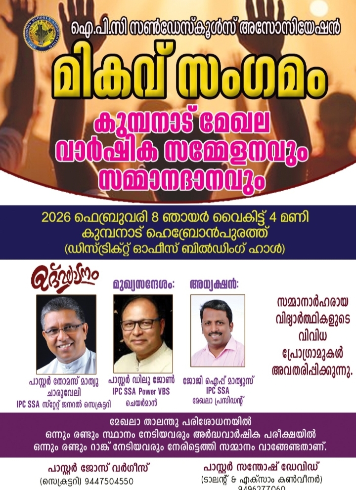 കുമ്പനാട്: ഐപിസി സൺഡേസ്കൂൾസ് അസോസിയേഷൻ മേഖല ‘മികവ് സംഗമം’ ഫെബ്രുവരി 8 ഞായറാഴ്ച്ച വൈകിട്ട് 4 ന് കുമ്പനാട് ഹെബ്രോൻപുരത്ത് ഡിസ്ട്രിക്റ്റ് ഓഫീസ് ബിൽഡിങ് ഹാളിൽ നടക്കും.