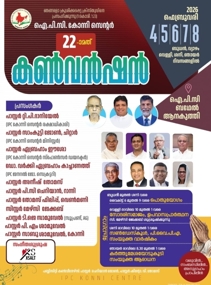 കോന്നി: ഇന്ത്യാ പെന്തക്കോസ്ത് ദൈവസഭ കോന്നി സെൻ്ററിൻ്റെ 22-ാം മത് സെൻ്റർ കൺവൻഷൻ 2026 ഫെബ്രുവരി 04 മുതൽ 08 വരെ കോന്നി ആനകുത്തി ബെഥേൽ സഭാ ഗ്രൗണ്ടിൽ നടക്കും.