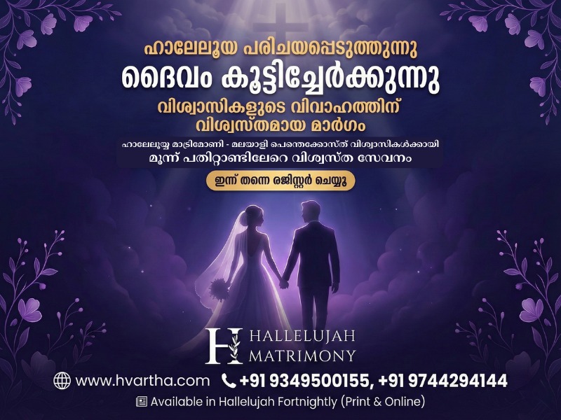 നിങ്ങളുടെ മക്കൾക്ക് യോജിച്ച പങ്കാളിയെ കണ്ടെത്തുവാൻ ഹാലേലൂയ പോലെ സുരക്ഷിതവും മികച്ചതും ആയ മറ്റൊരു മാർഗ്ഗമില്ല. ഇന്ന് തന്നെ പ്രൊഫൈലും ഫോട്ടോയും വാട്സ്ആപ്പ് ചെയ്യുക. കൂടുതൽ വിവരങ്ങൾക്കായി വിളിക്കുക / വാട്സ്ആപ് ചെയ്യുക +91 9349500155, 9744294144