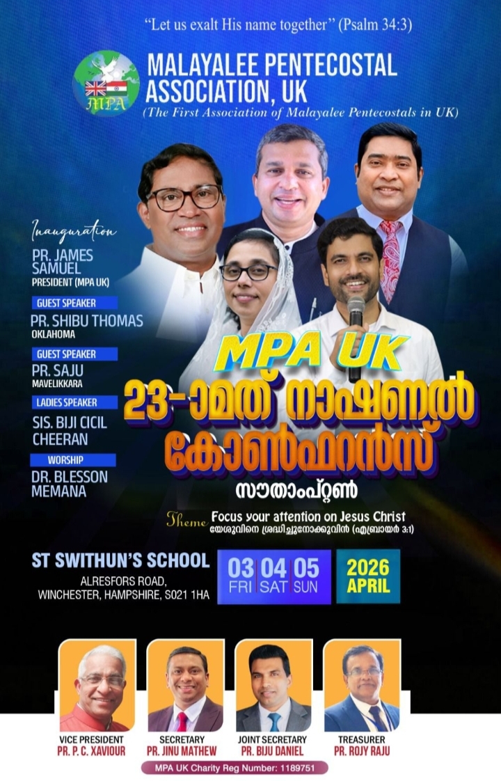 യു.കെ. മലയാളി പെന്തക്കോസ്ത് സമൂഹത്തിന്റെ ആദ്യത്തെ ഐക്യ കൂട്ടായ്മയായ മലയാളി പെന്തക്കോസ്റ്റൽ അസോസിയേഷൻ യു. കെ. യുടെ 23 മത് നാഷണൽ കോൺഫറൻസ് ഇംഗ്ലണ്ടിലെ തുറമുഖ പട്ടണമായ സൗതാംപ്റ്റണിൽ 2026 ഏപ്രിൽ 3 മുതൽ 5 വരെ നടത്തപ്പെടുന്നു. എം. പി. എ. യു കെ യുടെ പ്രസിഡന്റ് പാസ്റ്റർ ജെയിംസ് സാമുവേൽ ഉദ്ഘാടനം നിർവഹിക്കും. ഈ വർഷത്തെ മുഖ്യ പ്രഭാഷകരായി പാസ്റ്റർ ഷിബു തോമസ് ഒക്കലഹോമ, പാസ്റ്റർ സജു മാവേലിക്കര, സിസ്റ്റർ ബിജി സിസിൽ ചീരൻ എന്നിവർ ദൈവ വചനം ശുശ്രൂഷിക്കുകയും, ഡോക്ടർ ബ്ലസൻ മേമന ആരാധനകൾക്ക് നേതൃത്വം നൽകുകയും ചെയ്യുന്നു.