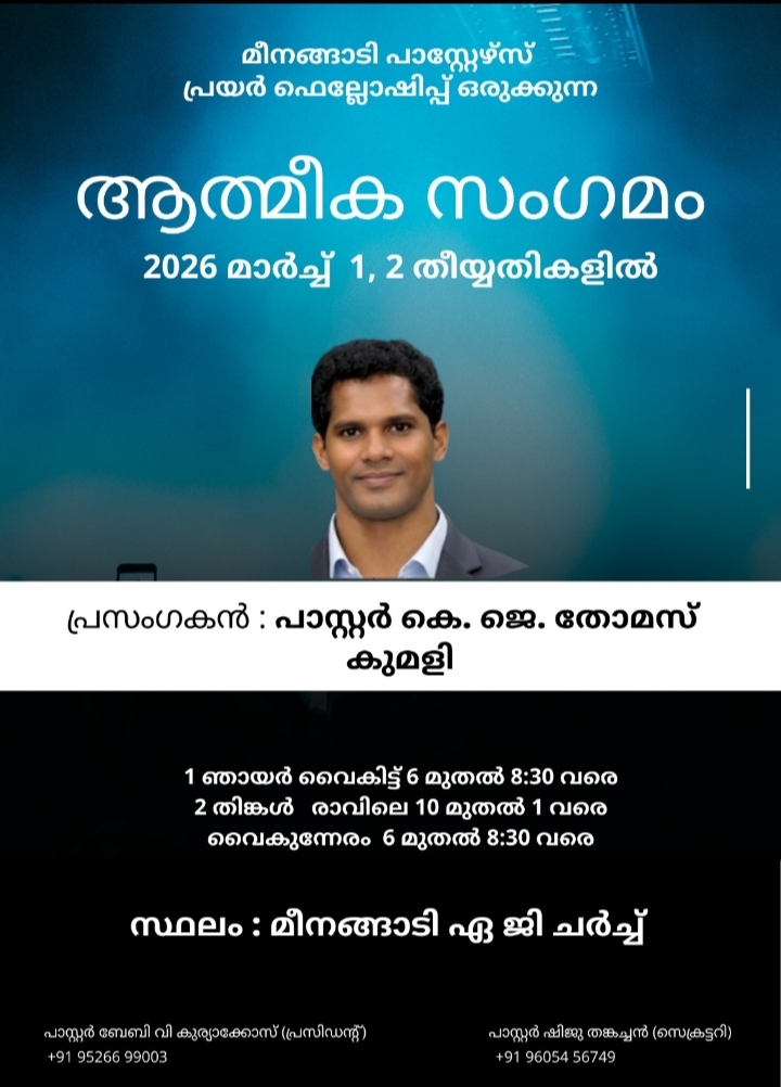 ഈ മീറ്റിംഗിലേക്കു എല്ലാ ദൈവദാസന്മാരും ദൈവജനവും പങ്കെടുത്തു അനുഗ്രഹം പ്രാപിക്കുവാൻ ഏവരേയും ഹാർദ്ദവമായി സ്വാഗതം ചെയ്യുന്നതായി സംഘടകർ അറിയിച്ചുകൊള്ളുന്നു.