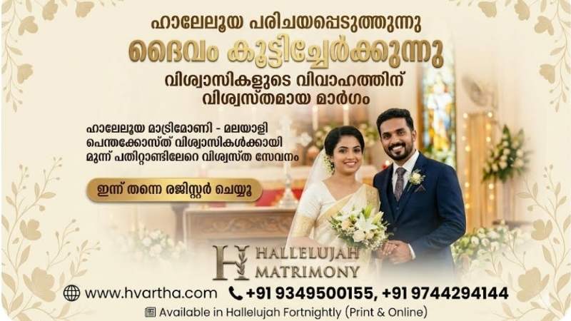 നിങ്ങളുടെ മക്കൾക്ക് യോജിച്ച പങ്കാളിയെ കണ്ടെത്തുവാൻ ഹാലേലൂയ പോലെ സുരക്ഷിതവും മികച്ചതും ആയ മറ്റൊരു മാർഗ്ഗമില്ല. ഇന്ന് തന്നെ പ്രൊഫൈലും ഫോട്ടോയും വാട്സ്ആപ്പ് ചെയ്യുക. കൂടുതൽ വിവരങ്ങൾക്കായി വിളിക്കുക / വാട്സ്ആപ് ചെയ്യുക +91 9349500155, 9744294144