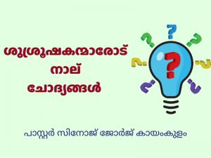 ഉപസംഹാരം: ഈ കുറിപ്പിൽ നാല് ചോദ്യങ്ങൾ മാത്രം ഉൾപ്പെടുത്തി നിർത്തട്ടെ. ചോദ്യങ്ങൾക്ക് നിങ്ങളുടെ നിരൂപണങ്ങൾ ചിലപ്പോൾ വ്യത്യസ്തമായിരിക്കാം. ഒരു പക്ഷേ മറുപടി പൊതുവിൽ സാദ്ധ്യമല്ല എന്നിരിക്കാം. എന്നാൽ എന്നോട് യോജിക്കാൻ കഴിയാത്തവർ തീർച്ചയായും നിങ്ങളുടെ നിരൂപണങ്ങൾ മറുപടിയായി നൽകണേ. പലരും ബഹുമാന്യരായ ശുശ്രൂഷകർ രാജിവെയ്ക്കണം എന്ന് ശബ്ദം ഉയർത്തുമ്പോൾ അത് തികച്ചും നന്നല്ല. മാത്രമല്ല സഭയ്ക്കും ദൈവീക ശുശ്രൂഷയ്ക്കും ഭൂഷണമല്ല എന്നത് ഓർക്കുക മറിച്ച് ശുശ്രൂഷകർ തങ്ങളുടെ അവകാശങ്ങൾ എന്തൊക്കെയെന്ന് മനസ്സിലാക്കി ശുശ്രൂഷകളിൽ ശ്രദ്ധ കേന്ദ്രീകരിക്കുക. മുതിർന്നവർ പിൻമുറക്കാർക്ക് അവരുടെ അവകാശങ്ങളായ ശുശ്രൂഷകൾക്ക് അവസരങ്ങൾ നൽകുകയും തങ്ങളുടെ അവകാശങ്ങളായ ശുശ്രൂഷകൾ മാത്രം നിർവ്വഹിക്കുകയും ചെയ്യുക. തട്ടിപ്പറിച്ചതിന് തിരുസന്നിധിയിൽ താതൻ തരം തിരിച്ച് തിരികെ തരും.