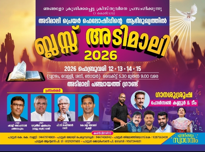 അടിമാലി: അടിമാലി പ്രയർ ഫെലോഷിപ്പിന്റെ ആഭിമുഖ്യത്തിൽ ബ്ലെസ്സ് അടിമാലി 2026 എന്ന പേരിൽ സുവിശേഷ മഹായോഗവും സംഗീത വിരുന്നും ഫെബ്രുവരി 12 വ്യാഴം മുതൽ 15 ഞായർ വരെ അടിമാലി പഞ്ചായത്ത് ഗ്രൗണ്ടിൽ നടക്കും.