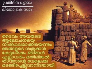 ഞങ്ങൾക്കു അറിവു കിട്ടിപ്പോയെന്നും ദൈവം അവരുടെ ആലോചനയെ നിഷ്ഫലമാക്കിയെന്നും ഞങ്ങളുടെ ശത്രുക്കൾ കേട്ടശേഷം ഞങ്ങൾ എല്ലാവരും മതിലിങ്കൽ താന്താന്റെ വേലെക്കു മടങ്ങിച്ചെല്ലുവാനിടയായി -നെഹെമ്യാവു 4:15