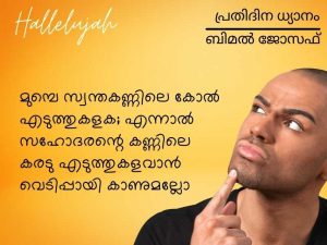 മുമ്പെ സ്വന്തകണ്ണിലെ കോൽ എടുത്തുകളക; എന്നാൽ സഹോദരന്റെ കണ്ണിലെ കരടു എടുത്തുകളവാൻ വെടിപ്പായി കാണുമല്ലോ -ലൂക്കോസ് 6:42