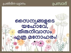 സൈന്യങ്ങളുടെ യഹോവേ, തിരുനിവാസം എത്ര മനോഹരം! -സങ്കീർത്തനം 84:1നമ്മുടെ ചുറ്റുപാടുമുള്ള പരിതഃസ്ഥിതികൾ ഇടുക്കത്തിലേക്കും നിരാശയിലേക്കും നമ്മെ കടത്തിവിടുമ്പോൾ നമ്മിലുള്ള ദൈവസാനിധ്യം ആ സാഹചര്യങ്ങളെ മാറ്റി നമ്മെ ശക്തിയോടെ നിൽക്കാൻ തക്കവണ്ണം മനോഹാരിതമാക്കുന്നു. ദൈവത്തിലുള്ള പൂർണ ആശ്രയവും അഭയവും സമർപ്പണവുമത്രെ നമ്മെ എല്ലാ നിലയിലും നിലനിർത്തുന്നതും നമ്മുടെ ജീവിതത്തെ കൂടുതൽ മനോഹാരിതമാക്കുന്നതും.
