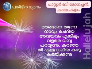 അങ്ങനെ തന്നേ നാവും ചെറിയ അവയവം എങ്കിലും വളരെ വമ്പു പറയുന്നു. കുറഞ്ഞ തീ എത്ര വലിയ കാടു കത്തിക്കുന്നു (യാക്കോബ് 3:5).