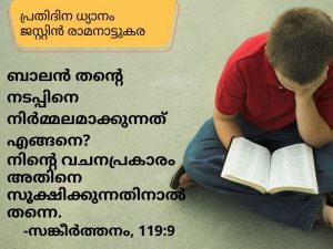 ദൈവാത്മാവ് ദൈവവചനത്തിലൂടെ ചോദിക്കുന്ന ചോദ്യം ഇതാണ്, എങ്ങനെയാണ് ഒരുവന്റെ നടപ്പ് നിർമ്മലമാക്കുവാൻ കഴിയുക? ജീവിതത്തിൽ എങ്ങനെ നേരോടെ ജീവിക്കുവാൻ കഴിയും? ബാല്യകാലത്ത് ദൈവവചനം പഠിക്കുക വഴി, ദൈവവചന പ്രകാരം അതിനെ സൂക്ഷിക്കുക വഴി നടപ്പ് നിർമ്മലമാക്കാം.