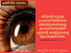 ദൈവവചനത്തിൽ അനേകം അത്ഭുതങ്ങൾ ഉണ്ട്. ഒരു ഭക്തന്റെ ആത്മാർത്ഥമായ ആഗ്രഹമാണ് ദൈവ വചനത്തിലെ അത്ഭുതങ്ങളെ കാണുന്നതിനായി ആത്മീയ കണ്ണുകളെ തുറക്കണമേഎന്നുള്ളപ്രാർത്ഥന.