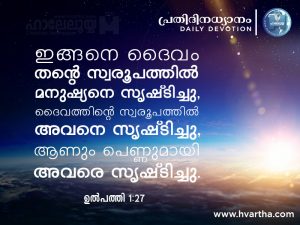 ഇങ്ങനെ ദൈവം തൻ്റെ സ്വരൂപത്തിൽ മനുഷ്യനെ സൃഷ്ടിച്ചു, ദൈവത്തിൻ്റെ സ്വരൂപത്തിൽ അവനെ സൃഷ്ടിച്ചു, ആണും പെണ്ണുമായി അവരെ സൃഷ്ടിച്ചു.