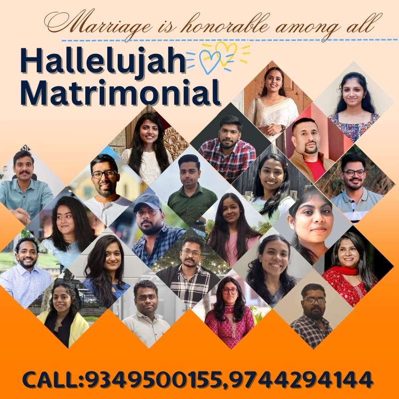 നിങ്ങളുടെ മക്കൾക്ക് യോജിച്ച പങ്കാളിയെ കണ്ടെത്തുവാൻ ഹാലേലൂയ പോലെ സുരക്ഷിതവും മികച്ചതും ആയ മറ്റൊരു മാർഗ്ഗമില്ല. ഇന്ന് തന്നെ പ്രൊഫൈലും ഫോട്ടോയും വാട്സ്ആപ്പ് ചെയ്യുക. കൂടുതൽ വിവരങ്ങൾക്കായി വിളിക്കുക / വാട്സ്ആപ് ചെയ്യുക +91 9349500155, 9744294144