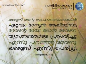 ജീവിതത്തിൽ ഇനിയൊരു ഉയർച്ച ഉണ്ടാകില്ലെന്ന് ചിന്തിച്ചു നിരാശപ്പെട്ടിരിക്കയാണോ, യബേസ്സിനെ പോലെ ദൈവത്തിൽ ആശ്രയിച്ചു പ്രാർത്ഥിക്കുക. ദൈവം നിന്നെ മാനിക്കും. നിൻ്റെ പ്രാർത്ഥനകൾക്ക് അവൻ വേഗം ഉത്തരം തരും.