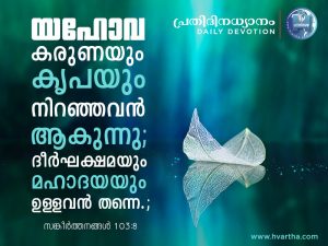 യഹോവ കരുണയും കൃപയും നിറഞ്ഞവൻ ആകുന്നു; ദീർഘക്ഷമയും മഹാദയയും ഉള്ളവൻ തന്നെ. സങ്കീര്ത്തനങ്ങള് 103:8