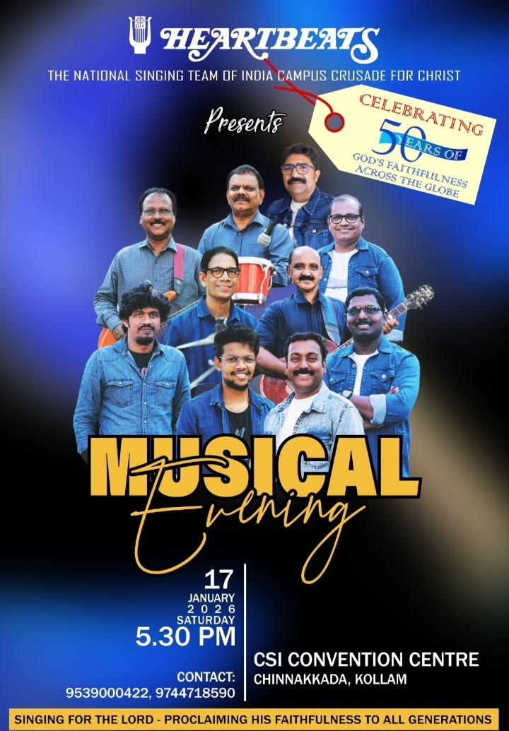 കൊല്ലം: ഇന്ത്യാ ക്യാമ്പസ് ക്രൂസേഡ് ഫോർ ക്രൈസ്റ്റിൻ്റെ ദേശീയ സംഗീത വിഭാഗമായ ഹാർട്ട് ബീറ്റ്സ് സംഘടിപ്പിക്കുന്ന സംഗീത സായാഹ്നം 2026 ജനുവരി 17 , ശനിയാഴ്ച വൈകുന്നേരം 5:30 ന്