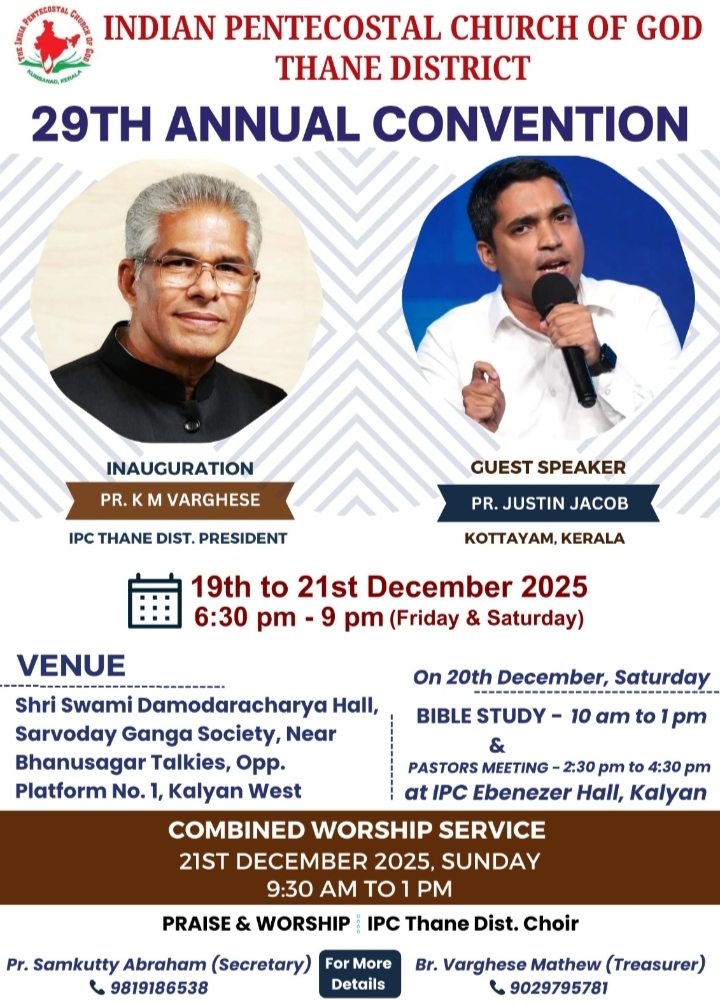 താനെ: ഐപിസി താനെ ഡിസ്ട്രിക്റ്റ് 29 ആം വാർഷിക കൺവൻഷൻ കല്യാൺ വെസ്റ്റ് ശ്രീസ്വാമി ദാമോദരാചാര്യ ഹാളിൽ ഡിസംബർ 19 മുതൽ 21 വരെ നടക്കും. ഐപിസി താനെ ഡിസ്ട്രിക്ട് പ്രസിഡണ്ട് പാസ്റ്റർ കെ. എം. വർഗീസ് ഉദ്ഘാടനം ചെയ്യും. പാസ്റ്റർ ജസ്റ്റിൻ ജേക്കബ്, കോട്ടയം മുഖ്യപ്രഭാഷനായിരിക്കും. ഐപിസി താനേ ഡിസ്ട്രിക്റ്റ് ക്വയർ പ്രെയ്സ് ആൻഡ് വർഷിപ്പ് നയിക്കും.