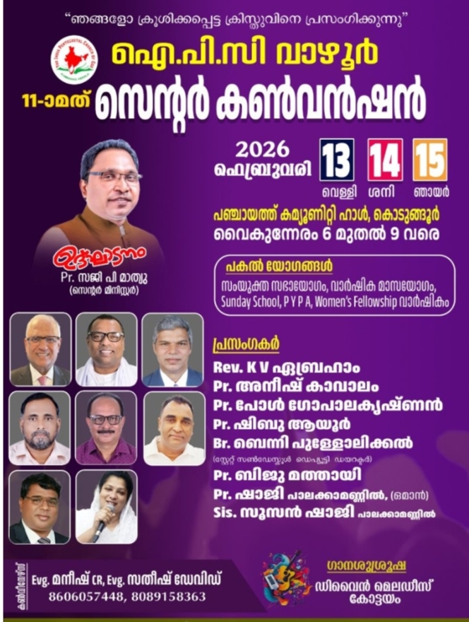 കൊടുങ്ങൂർ: ഐപി.സി വാഴൂർ സെന്റർ 11-ാമത് കൺവെൻഷൻ ഫെബ്രുവരി 13 മുതൽ 15 (വെള്ളി, ശനി, ഞായർ) വരെ വാഴൂർ പഞ്ചായത്ത് കമ്മ്യൂണിറ്റി ഹാളിൽ നടക്കും. സെന്റർ മിനിസ്റ്റർ പാസ്റ്റർ സജി പി. മാത്യു ഉത്ഘാടനം നിർവഹിക്കും.