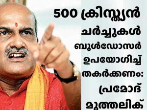 മൈസൂരു: കർണാടകയിലെ 500 അനധികൃത ക്രിസ്ത്യൻ ചർച്ചുകളുടെ ലിസ്റ്റ് തങ്ങളുടെ പക്കലുണ്ടെന്നും അത് ബുൾഡോസർ ഉപയോഗിച്ച് തകർക്കണമെന്നും തീവ്രഹിന്ദുത്വ സംഘടനയായ ശ്രീരാമ സേനയുടെ നേതാവ് പ്രമോദ് മുത്തലിക്.