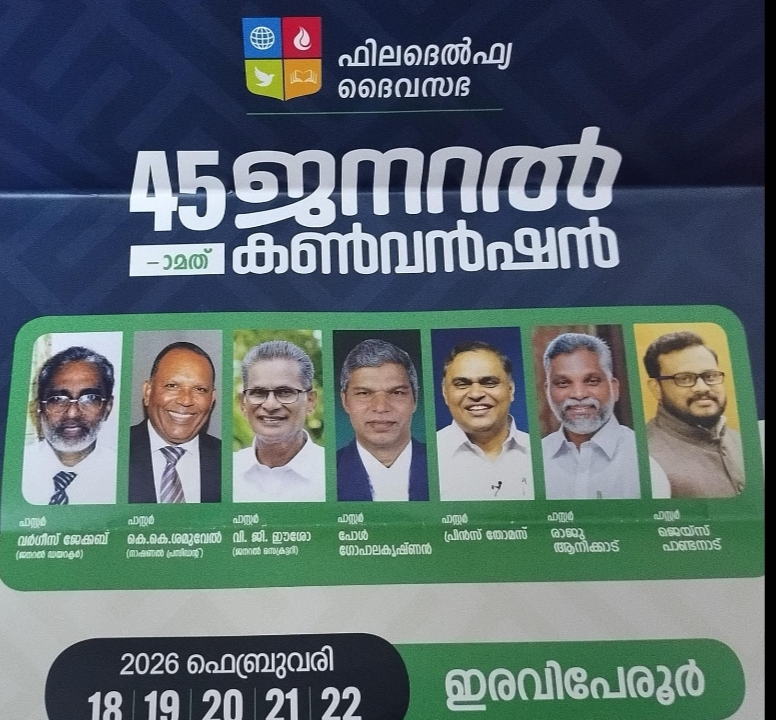 ഇരവിപേരൂർ: ഫിലദെൽഫ്യ ചർച്ച് ഓഫ് ഗോഡിന്റെ നാൽപത്തിയഞ്ചാമത് ജനറൽ കൺവൻഷൻ നാളെ (Feb 18 ) മുതൽ 22 വരെ ഫിലദെൽഫ്യ ഗ്രൗണ്ടിൽ നടക്കും. സഭയുടെ ഇന്റർനാഷണൽ പ്രസിഡണ്ട് റവ. എൻ എ ഫിലിപ്പ് ഉദ്ഘാടനം ചെയ്യും.