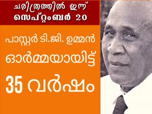 ഇൻഡ്യാ പെന്തെക്കോസ്തു ദൈവ സഭയുടെ സ്ഥാപക പിതാക്കന്മാരിൽ പ്രെമുഖനും പിൽക്കാല അദ്ധ്യക്ഷനും അസാധാരണ മികവുള്ള വേദ പണ്ഡിതനുമായിരുന്നു പാസ്റ്റർ ടി.ജി. ഉമ്മൻ. അഞ്ചര പതിറ്റാണ്ടുനീണ്ട ഫലകരമായ ശുശ്രൂഷ തികച്ച് 1985 സെപ്തംബര് 20 ന് അദ്ദേഹം യാത്രയായി. ആ മഹാനായ ദൈവദാസൻ നമ്മെ വിട്ടുപിരിഞ്ഞിട്ട് 35 വർഷം പൂർത്തിയാകുകയാണിന്ന്.
