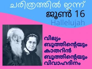 സാൽവേഷൻ ആർമി എന്ന ക്രൈസ്തവ പ്രസ്ഥാനത്തിൻ്റെ സ്ഥാപകനായ വില്യം ബൂത്തും കാതറിൻ ബൂത്തും വിവാഹിതരായത് 1855 ജൂൺ 16ന്. ഇംഗ്ലണ്ടിലെ നോട്ടിംഗാമിൽ 1829 ൽ ജനിച്ച വില്യം ബൂത്ത് മെതഡിസ്റ്റ് സഭയിലെ പട്ടക്കാരൻ ആയിരുന്നു. 1856 ൽ അദ്ദേഹം ആരംഭിച്ച ക്രിസ്ത്യൻ മിഷൻ ആണ് പിന്നീട് സാൽവേഷൻ ആർമി എന്ന് അറിയപ്പെട്ടത്. വില്യംബൂത്ത് ജനറൽ ആയും അതിനു താഴെയുള്ളവർ ക്യാപ്റ്റൻമാർ ആയും സൈനിക സംവിധാനത്തിലുള്ള സഭാഭരണ രീതിയാണ് രക്ഷാസൈന്യം സ്വീകരിച്ചത്. വലിയ ഉണർവ് പ്രഭാഷകനായിരുന്ന വില്യം ബൂത്ത് പാവപ്പെട്ടവരുടെ ആത്മീയവും ഭൗതികവുമായ ഉയർച്ചയ്ക്കുവേണ്ടി നിരന്തരം പ്രവർത്തിച്ചു. സുരക്ഷിതമായ പ്രവർത്തനമേഖല ഉപേക്ഷിച്ച് സമൂഹത്തിലേക്കിറങ്ങി പ്രവർത്തിക്കാൻ തീരുമാനിച്ച അദ്ദേഹത്തിൻ്റെ പ്രഭാഷണങ്ങൾ നിരവധി ആളുകളെ മാനസാന്തരത്തിലേക്കു നയിച്ചു.